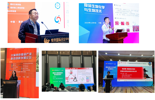 2024年11月2日-4日,由中国食品科技技术学会主办,四川大学、西南大学、四川省食品科学技术学会等10家高校单位共同承办的“中国食品科学技术学会第二十一届年会”在重庆市渝北区隆重召开。本届年会以“使命驱动下的食品科技与发展”为主题,围绕我国食品科技与产业发展的新变化、新需求、新任务,集结食品科技力量,凝聚行业新质之光,为川渝地区特色食品产业乃至我国食品产业高质量发展注入创新活力、贡献科技智慧。孙宝国、谢剑平、朱蓓薇、陈坚、钱锋、任发政、李培武、单杨、谢明勇、金征宇、薛长湖11位中国工程院院士及有关专家出席了大会。新葡的京集团8814vip副院长迟原龙教授、四川大学先进酿造科技创新中心主任许正宏教授、新葡的京集团8814vip皮革系副系主任吴重德教授、食品系副系主任任尧副教授、董怡副研究员、吴艳萍副研究员和卢云浩副研究员等多位师生出席了大会。