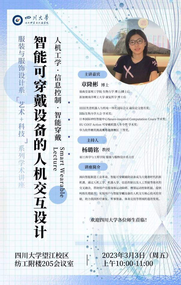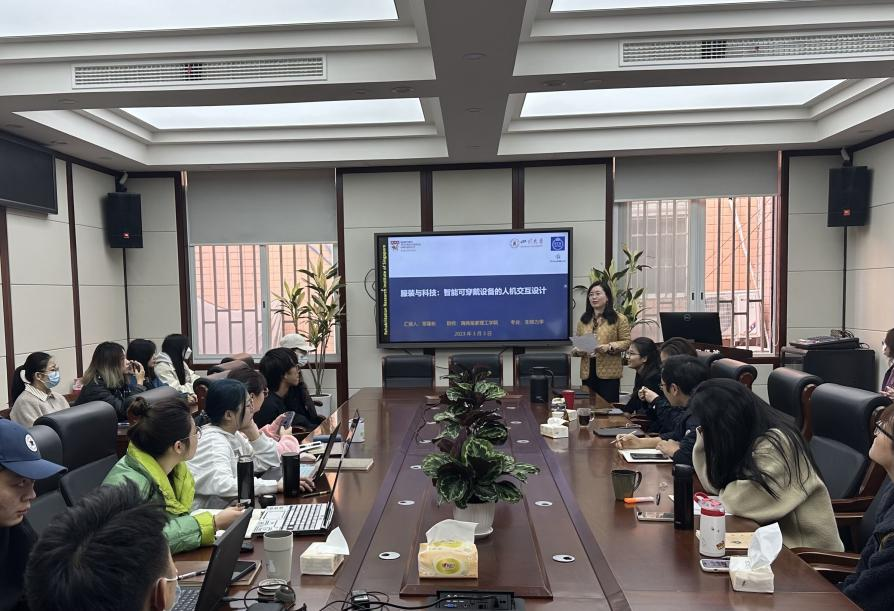 新葡的京集团8814vip服装与服饰设计系“艺术+科技”系列学术讲座于3月3日上午10:00在望江校区纺工附楼205会议室开讲,本期主题为“智能可穿戴设备的人机交互设计”,主讲嘉宾为瑞典皇家理工学院章隆彬博士,讲座由服装与服饰设计系杨璐铭教授主持,服装与服饰设计、服饰工程、材料学、机械工程等各专业师生参加了本次讲座。