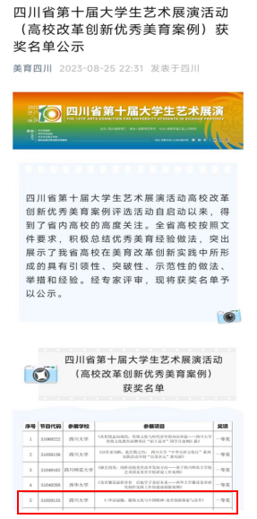 四川省第十届大学生艺术展演活动高校改革创新优秀美育案例活动于今年3月启动,自启动以来,得到了省内高校的高度关注。四川省大学生艺术展演活动代表我省大学生艺术教育的最高水平,每三年举办一次。本届大艺展由四川省教育厅主办、成都师范学院承办、温江区人民政府协办,以“厚植家国情怀,涵养进取品格”为主题,坚持立德树人,坚持面向全体,坚持弘扬中国精神。新葡的京集团8814vip美育改革案例《<华冠丽服:服饰文化与中国精神>美育创新探索与改革》获本届大学生艺术展演活动(高校改革创新优秀美育案例)一等奖。