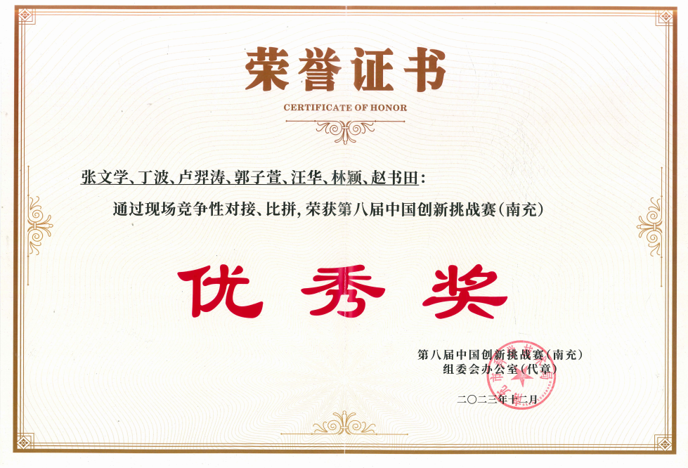 本次赛事由科技部指导,科技部火炬中心、四川省科技厅、南充市人民政府联合承办,南充市科学技术局组织实施,张文学教授指导的学生团队提出的《低酒度香桃果酒配套技术》针对性解决了相关企业技术需求。该方案经专家评审、竞争性接洽后获得采纳,荣获赛事组委会颁发优秀奖,同时与方案采纳企业签订10万元意向合作协议。