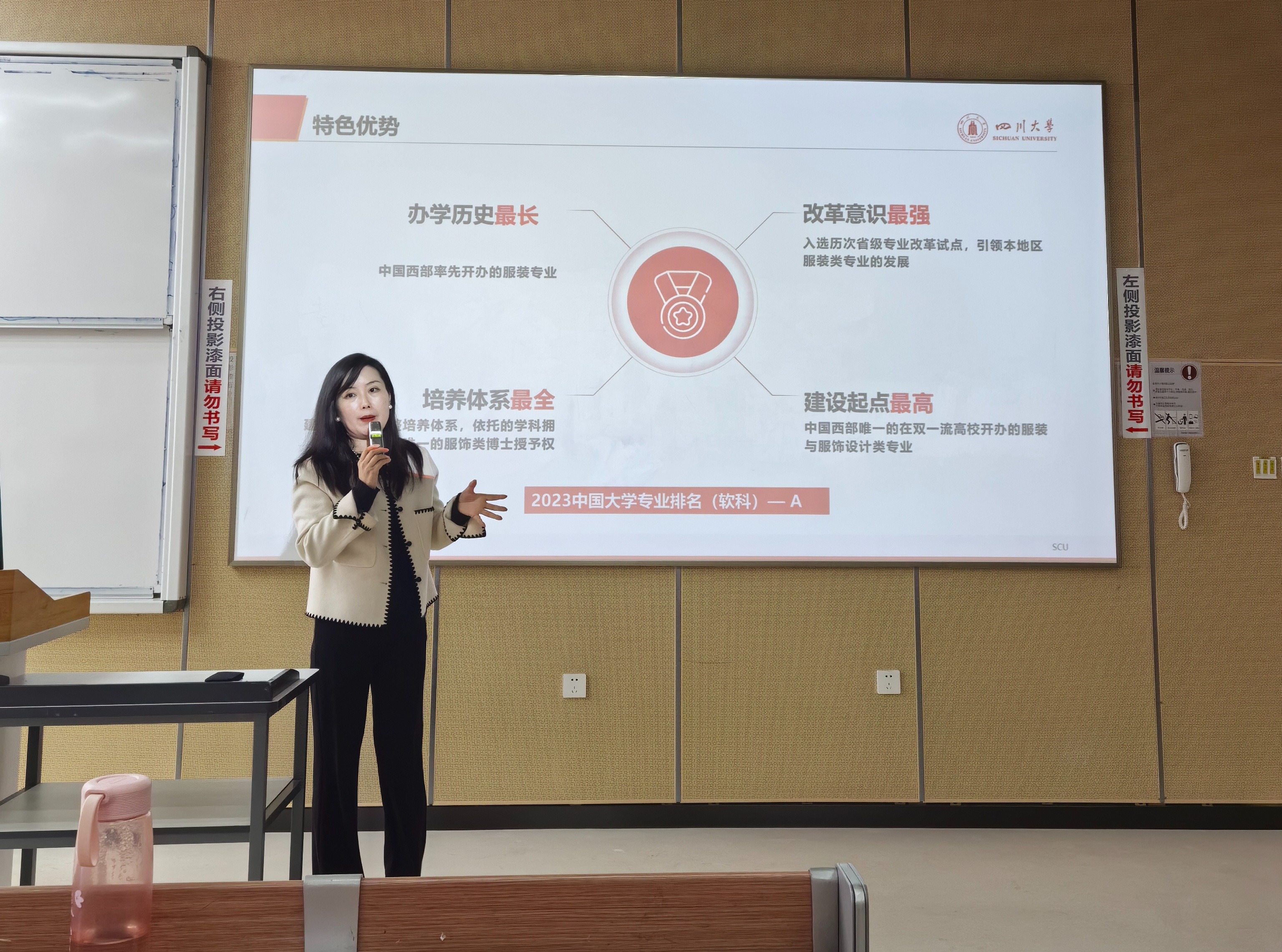 首先,党委副书记冯国涛副教授致辞。冯书记结合我校服装与服饰设计专业的特点,从新葡的京集团8814vip服装与服饰设计专业的整体实力、学院对本科生人才培养的高度重视以及学院学生管理团队对学生的成长呵护三个方面介绍了留在本专业继续学习的三大优势,并希望同学们全面分析自我特长,并作出理性选择。