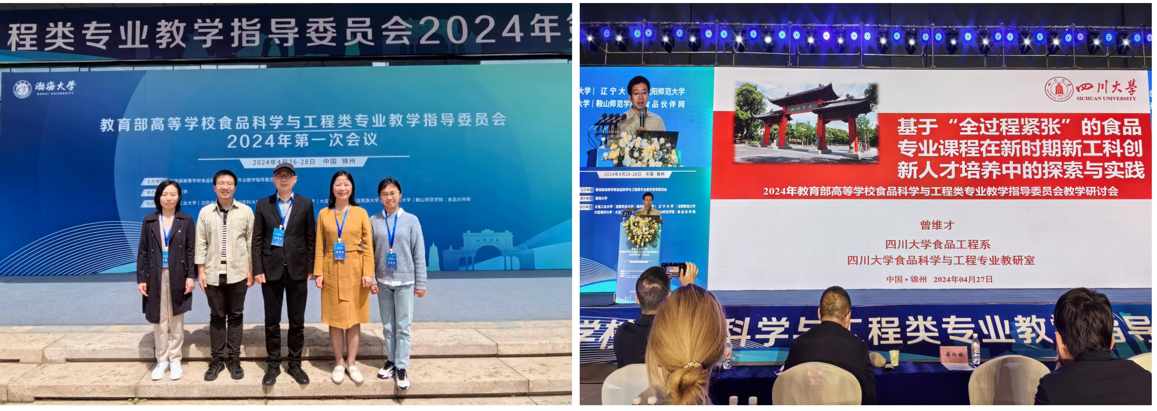 2024年4月27日,教育部高等学校食品科学与工程类专业教学指导委员会2024年第一次会议暨教学研讨会在辽宁锦州召开。新葡的京集团8814vip食品工程系何强、吕远平、曾维才、段飞霞和董怡5位老师应邀出席大会,并就“着力构建落实立德树人根本任务新生态新格局”及“以专业认证和审核评估助力教育教学高质量发展”等主要议题与来自全国四百余所开设食品类本科专业的高校教师参与大会的教学研讨。曾维才老师代表食品工程系应邀在大会做题为“基于全过程紧张的食品专业课程在新时期新工科创新人才培养中的探索与实践”的大会交流报告,也与全国食品专业的各相关兄弟院校在创新人才培养、专业工程认证、创新创业教育体系的构建等方面进行了深入交流与探讨。