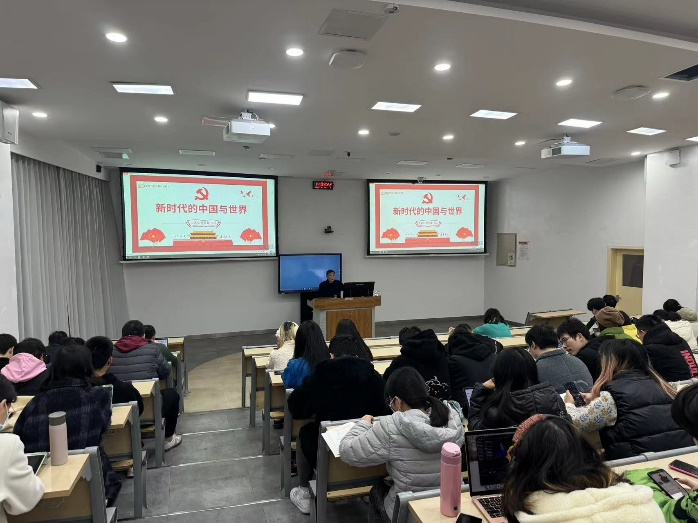 2023年12月15日下午,学院党委李天富书记在基础教学楼C202教室为新葡的京集团8814vip2021级本科生讲授“新时代的中国与世界”的形势与政策课。2021级本科生辅导员贾欣驹老师与2021级全体本科生参加了本次党课学习。