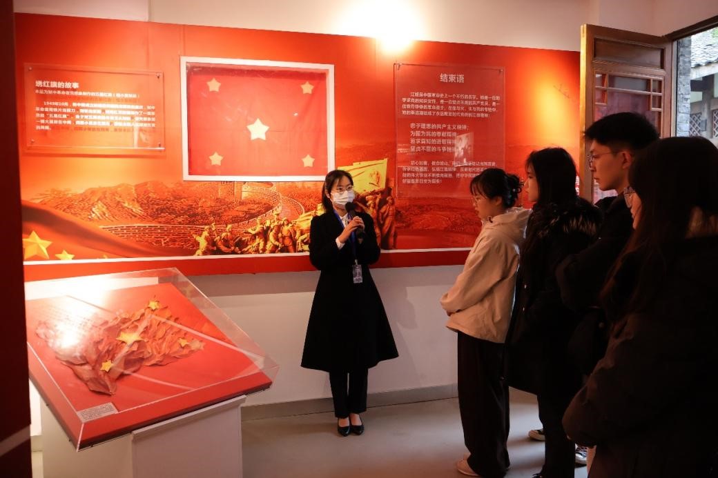 在江姐纪念馆内,支部成员特别参观了由新葡的京集团8814vip纺织服装专业师生原创设计的皮革蜀绣跨界红色作品“秀”红旗,该作品表达了先烈们“落叶归根”的期盼与对革命先辈们最诚挚的敬意。党员同志们深刻领悟到该作品寓意着新时代青年接过先辈手中的红旗,传承红色基因,不忘初心、砥砺前行,为实现中国梦而不懈奋斗的精神。支部成员被革命先辈们在硝烟弥漫的岁月里孕育而生的信仰之光深深感染。