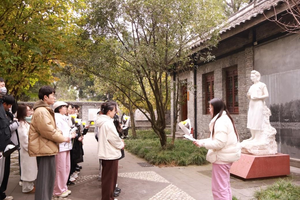 首先,支部成员在江姐汉白玉写实全身雕像前进行敬献鲜花缅怀仪式。支部成员手持菊花面向江竹筠烈士雕像肃穆伫立,向江竹筠烈士默哀,表达对江竹筠烈士理想信念、家国情怀的崇高敬意。接着有序地向江竹筠烈士敬献鲜花,并瞻仰江竹筠烈士雕像,深刻领悟江姐精神品格。