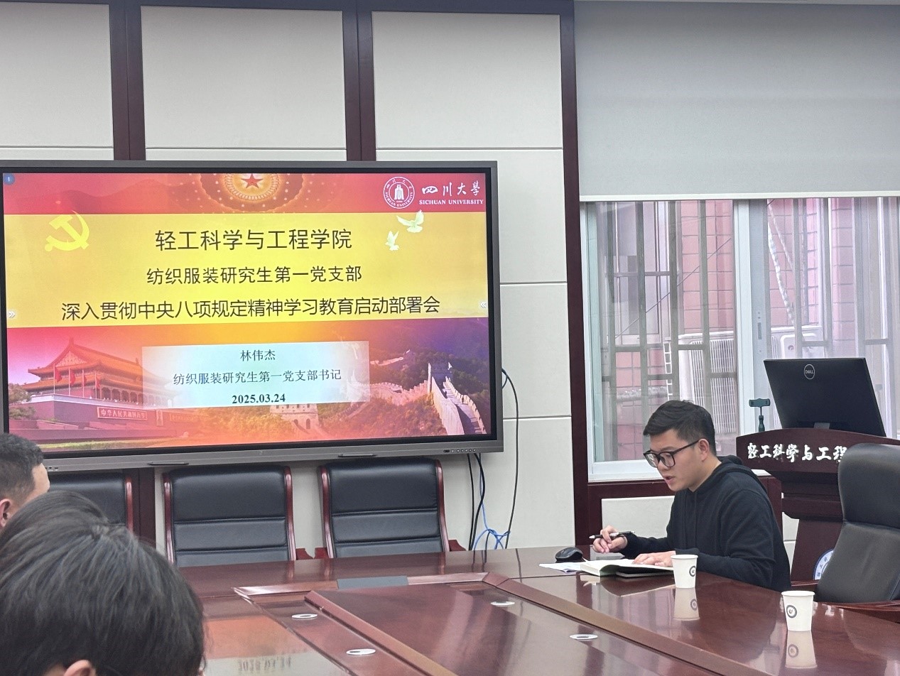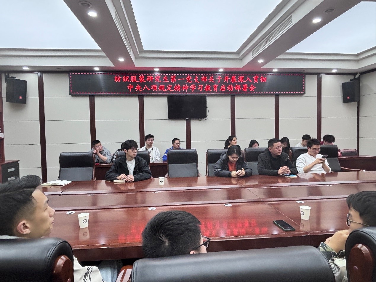 为深入学习贯彻党的二十届三中全会精神和习近平总书记关于党的自我革命重要论述,全面落实中共中央办公厅《关于开展贯彻中央八项规定精神学习教育》的要求,2025年3月24日,纺织服装研究生第一党支部在纺工附楼205会议室召开支部全体党员大会,进行深入贯彻中央八项规定精神学习教育启动部署启动相关工作。