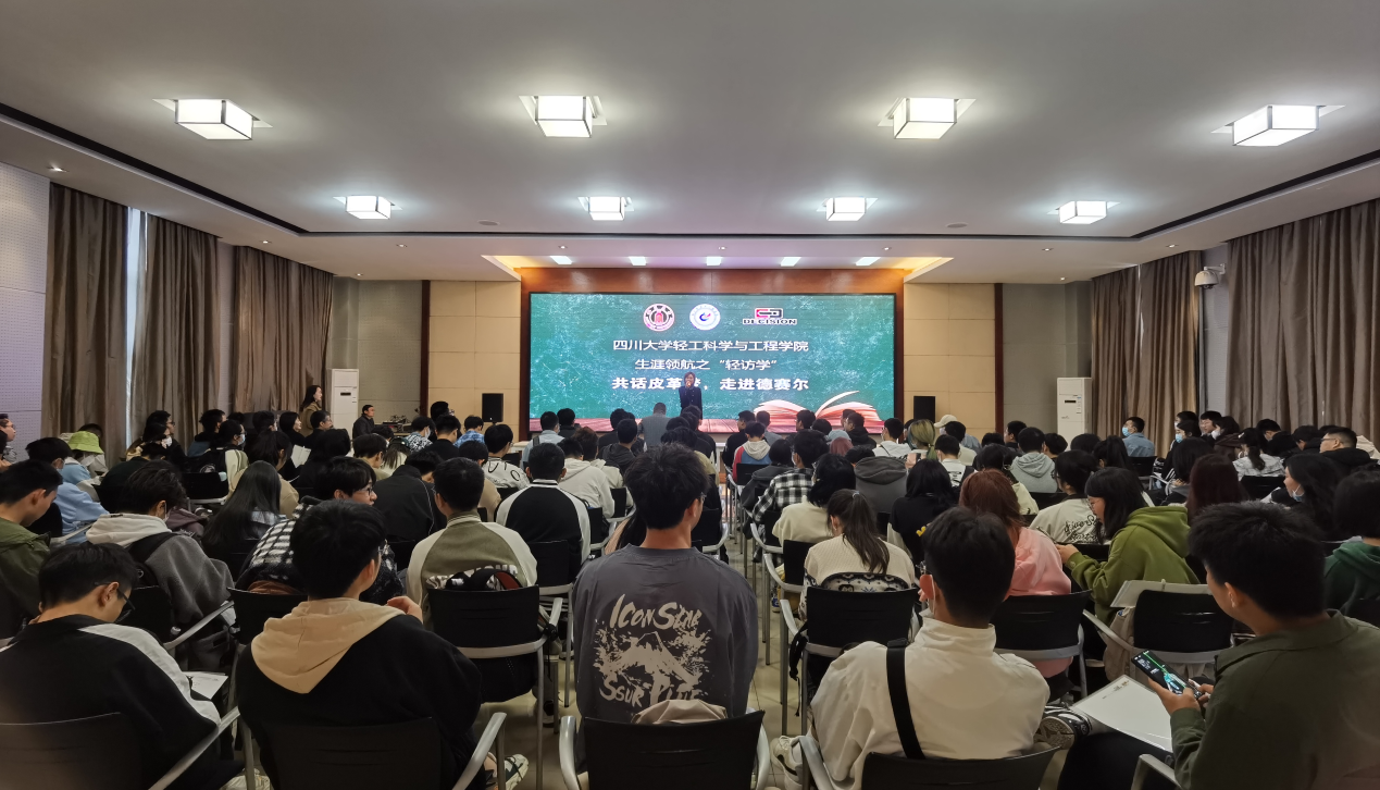 参观结束后,公司特别安排了新葡的京集团8814vip在公司工作多年的研发工程师、技术骨干等与同学们开展了“共话皮革梦,走进德赛尔”主题交流分享会。首先,公司总经理助理吴璐璐为同学们介绍了公司整体情况及德赛尔服务探索之路。接着,公司三位杰出校友——研发总工曾少余、产品线经理龙进、水厂研发经理孙青永博士分享了公司在皮革研发和皮革应用方面的思考,以及自己对工作的思考,也为同学们的生涯选择提出了建议。随后,学院党委冯国涛副书记进行了讲话,冯书记首先对德赛尔公司为此次访学活动提供的大力支持表示感谢,并谈到此次活动的开展加深了同学们对行业的认识,为大家做好未来职业发展规划提供了更清晰的认识和新的思考。最后,公司总经理丁学东进行了总结讲话。丁总勉励同学们,“大学是从考场到职场的转变,大学四年不仅应该深入扎实学好专业知识,更要为自己的未来职业规划做好充分思考和准备,同时职业规划很重要,既要仰望星空,也要扎根基层。”