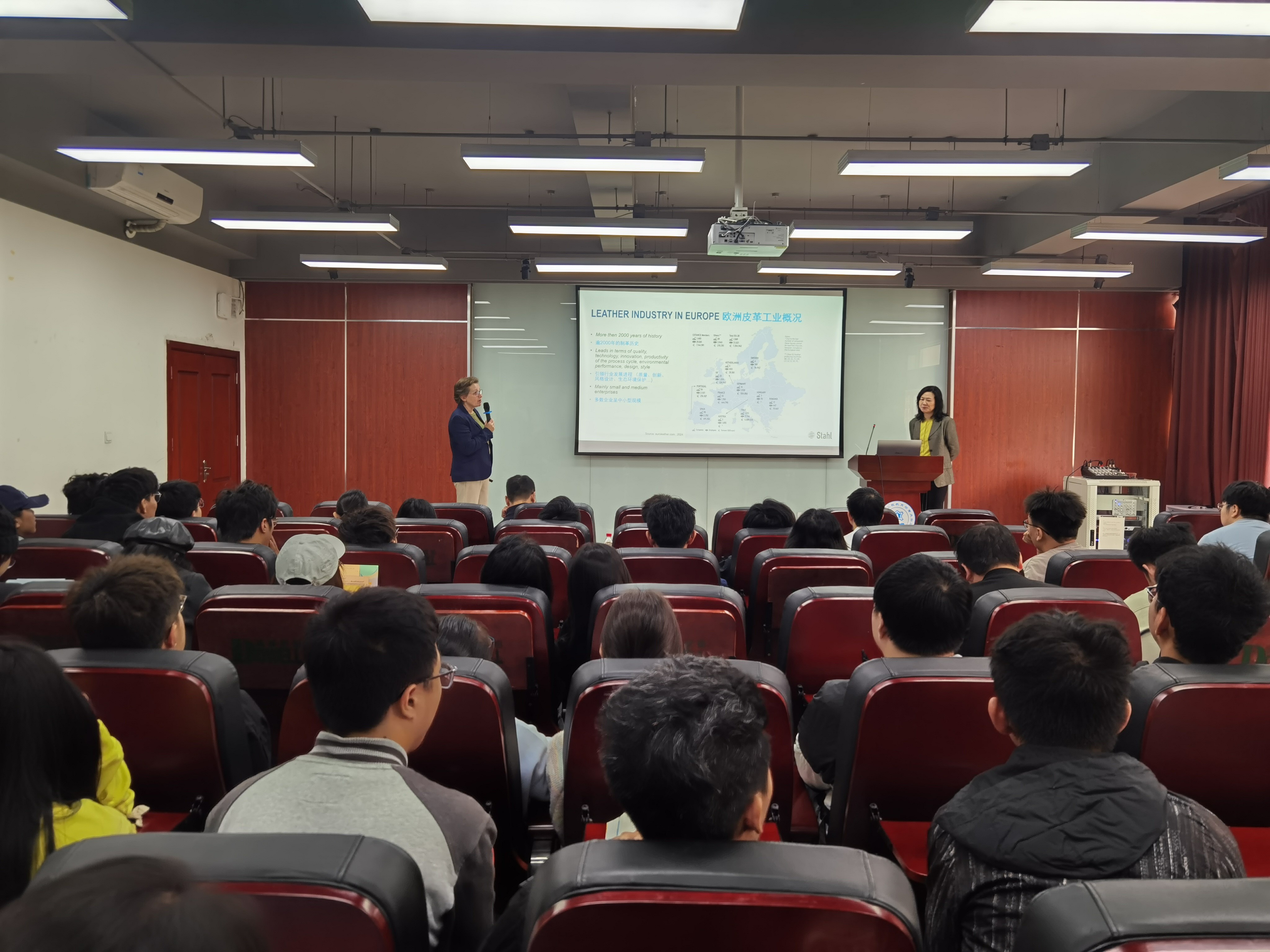 在学术报告开始之前,冯书记就本次论坛背景做了详细介绍,并对斯塔尔来宾表示热烈欢迎。接着,斯塔尔大中华区市场经理李艳女士向同学们介绍了主讲人Annelies的工作经历,并为同学们做详尽的翻译。Annelies拥有在多个技术岗位的工作经历,包括产品质量控制检测、皮革制作、生产设备管理和配色系统应用管理,作为汽车革生产应用的颜色调配系统专家,在全球业内享有极高的声誉。Annelies首先向大家介绍了斯塔尔新葡的京集团8814vip,接着以“色彩及其重要性”为主题,从色彩原理、色彩因素、色彩展现、色彩的重要性、欧洲皮革业几个方面进行讲授,对欧洲皮革工业的现状以及在欧洲市场的皮料来源、业态分析及产品流向进行了详细的介绍。
