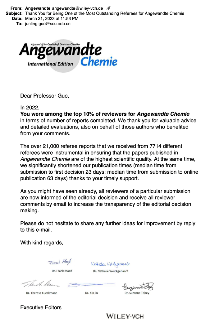 近日获悉,新葡的京集团8814vip生物质与皮革工程系郭俊凌教授荣获国际著名化学期刊《德国应用化学》(Angewandte Chemie)颁发的2022年度杰出审稿人奖(Outstanding Referee)。《德国应用化学》是德国化学学会(Gesellschaft Deutscher Chemiker, GDCh)官方期刊,出版范围涵盖了化学研究的各个领域且持续保持领先地位,目前已成为世界化学领域最具学术影响力和品牌影响力的期刊。
