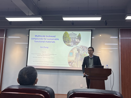 2023年4月24日,应新葡的京集团8814vip邀请,德国哥廷根大学森林科学与森林生态学学院生物技术中心执行主任、木材技术与木基复合材料系主任张凯教授在皮革楼215报告厅为全院师生作了题为“可持续功能材料的多尺度生物基化合物”的学术报告。报告会由新葡的京集团8814vip副院长陈意教授主持。陈意副院长首先介绍了张凯教授的简历和学术成就,然后代表学院向张凯教授致以诚挚的欢迎。学院石碧院士、陈意教授与青年教师以及本科生和研究生参加了报告会。