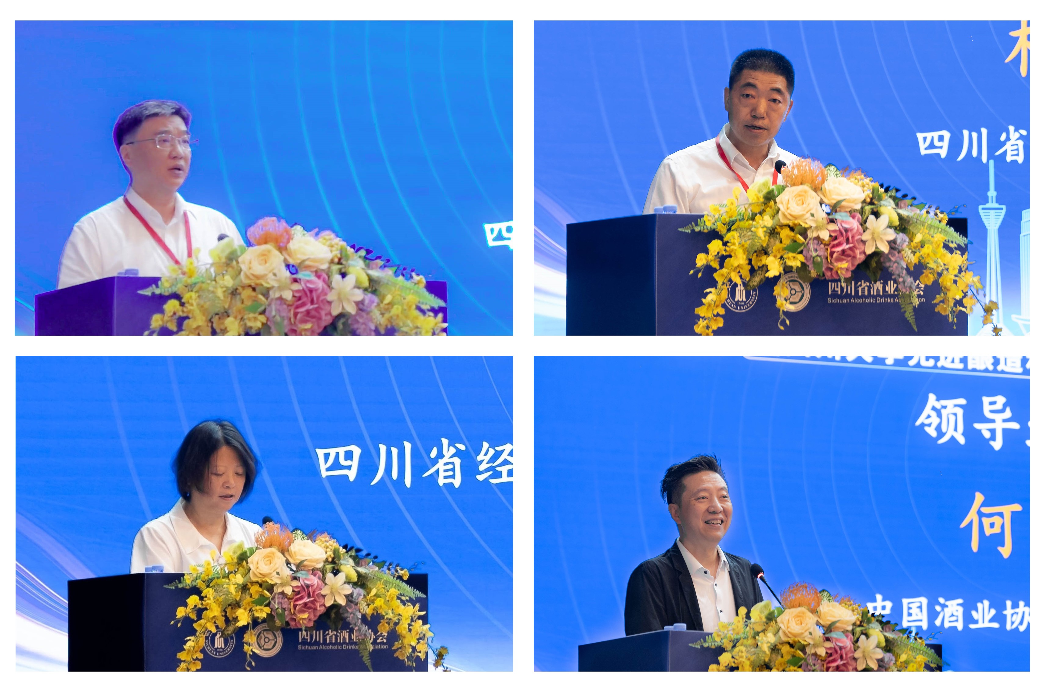 四川大学党委副书记刘晓虎,四川省酒业协会副会长杨官荣,四川省经济和信息化厅党组成员、副厅长冯锦花,中国酒业协会秘书长何勇分别致辞