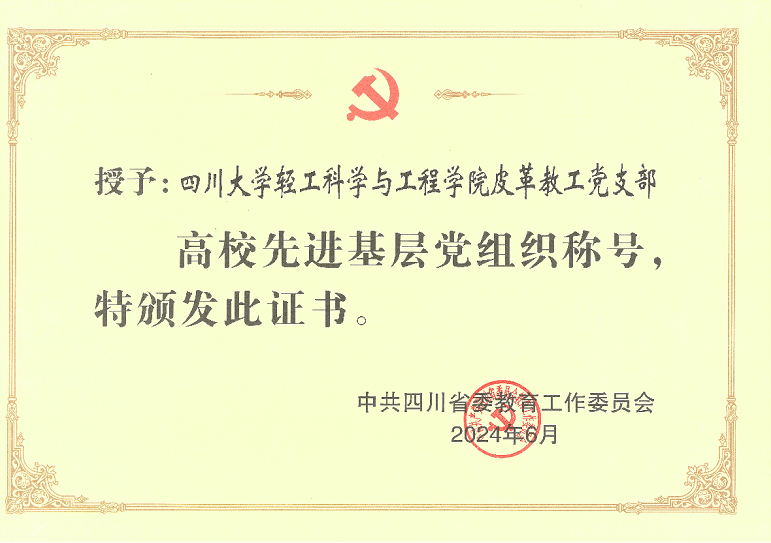 近日,四川省委教育工作委员会颁发了2024年高校“两优一先”证书,新葡的京集团8814vip皮革教工党支部荣获四川省高校先进基层党组织称号。
