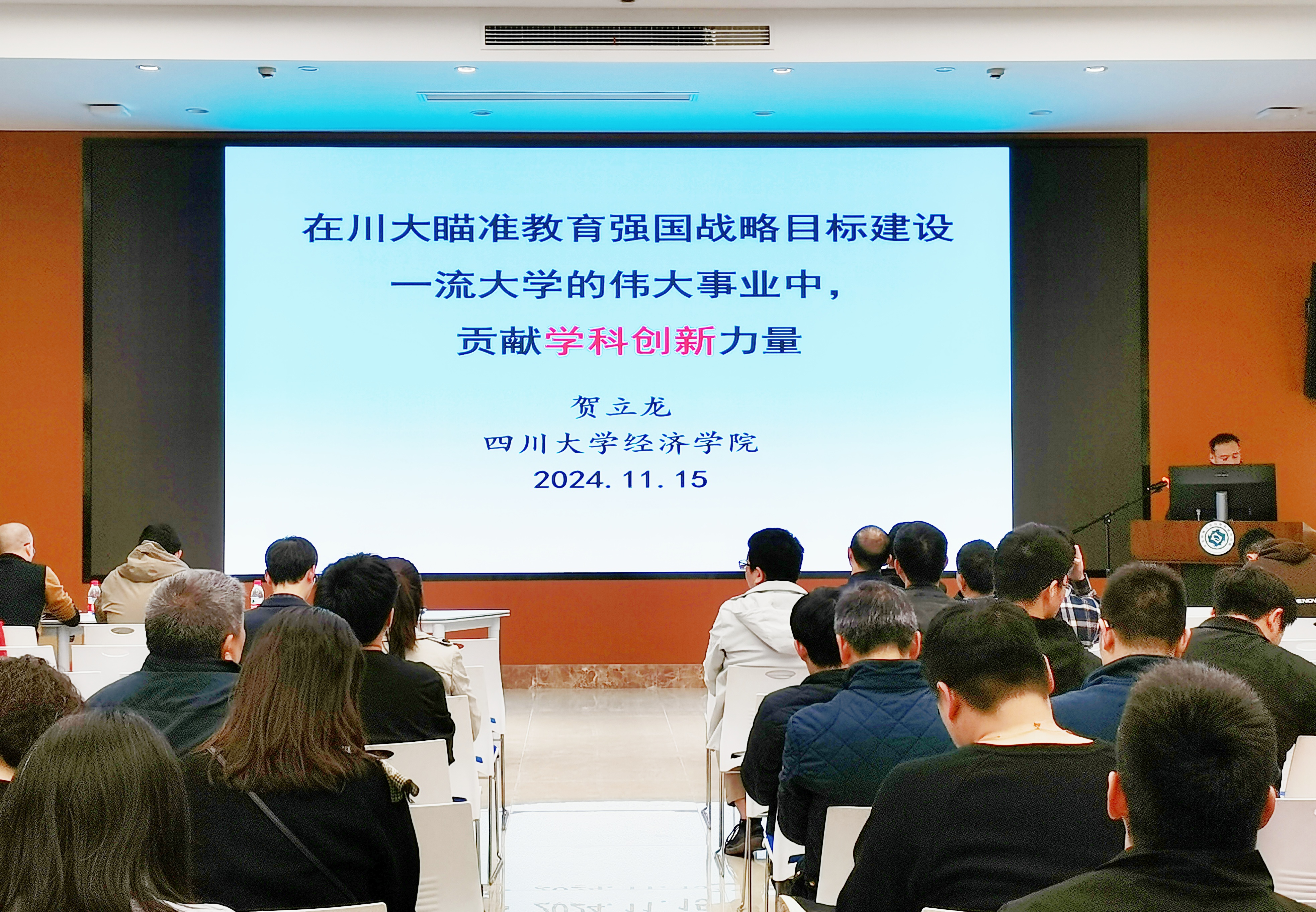 为深入学习贯彻二十届三中全会精神,增强学院教职工对全面深化改革的深刻理解与整体把握,11月15日下午,学院邀请学校二十届三中全会宣讲团成员、经济学院贺立龙教授在皮革楼工业互联网中心为新葡的京集团8814vip教职工讲授《在川大瞄准教育强国战略目标建设一流大学的伟大事业中,贡献学科创新力量》的专题讲座。