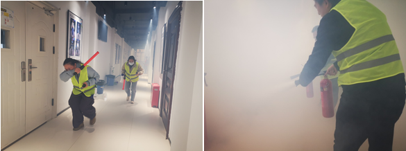 应急疏散演练模拟纺工附楼某实验室发生火情为背景,进行物管与学院应急处置队伍联动,同步开展了火灾事故报警、人员疏散、火灾扑救等多个环节的综合演练。