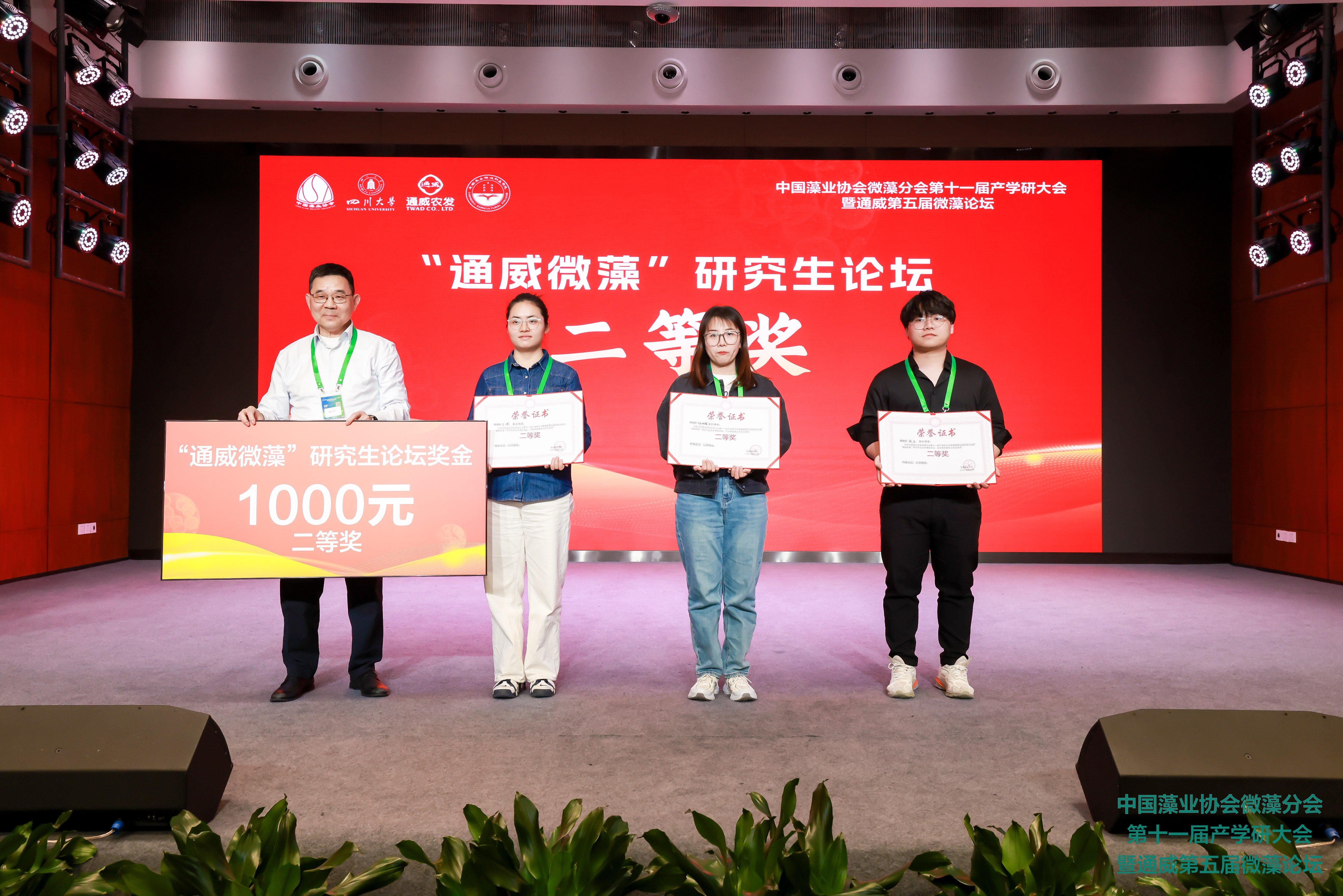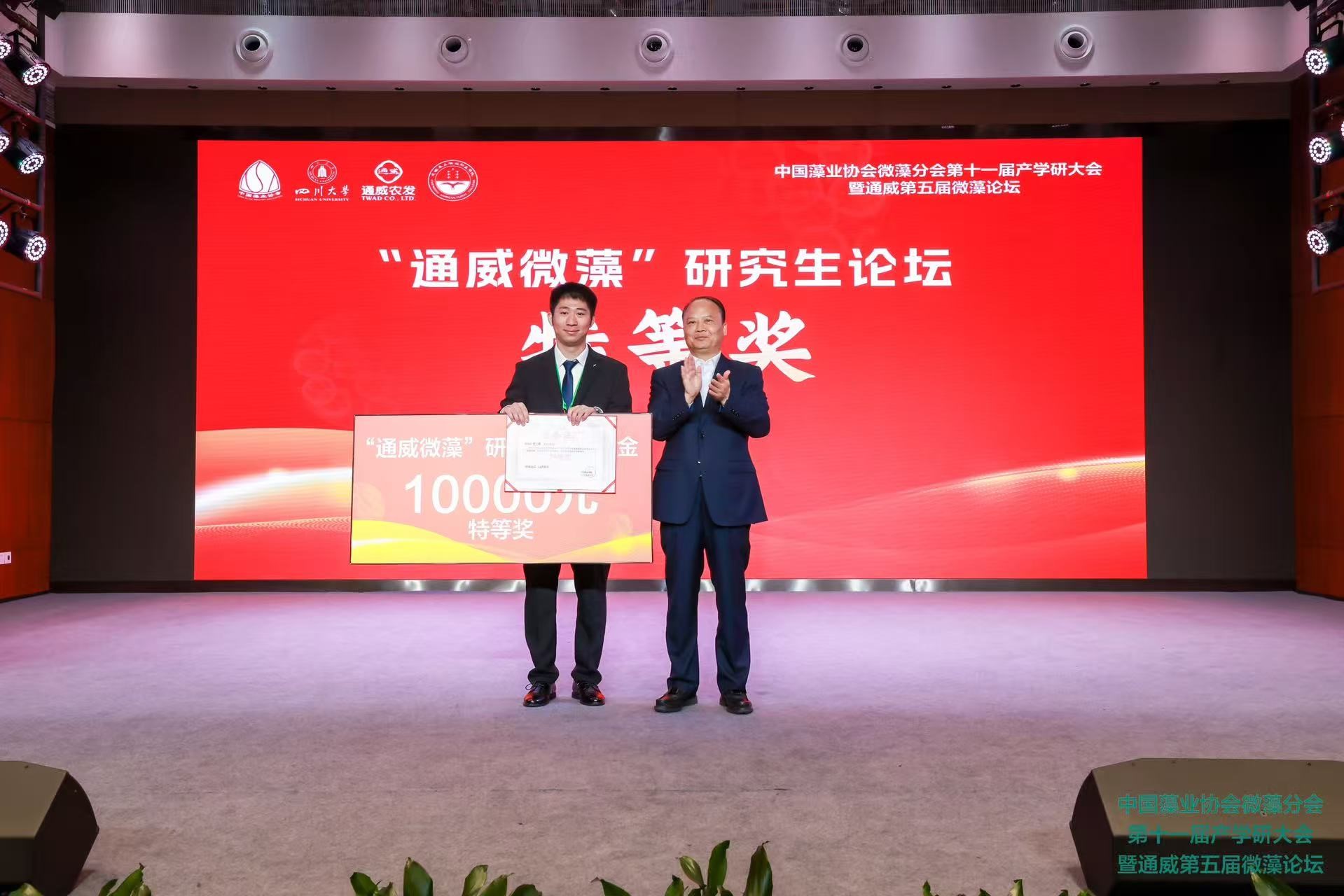 会议期间,首届“通威微藻”研究生论坛成功举行,来自四川大学、浙江大学、北京林业大学、西安交通大学、重庆大学等高校的研究生们,围绕微藻产业的最新科技研究,分享优秀报告。新葡的京集团8814vip彭必雨院长作为嘉宾,为荣获二等奖的优秀学子颁奖。新葡的京集团8814vip博士生刘海荣获特等奖,得到通威集团董事局刘汉元主席亲自颁奖。