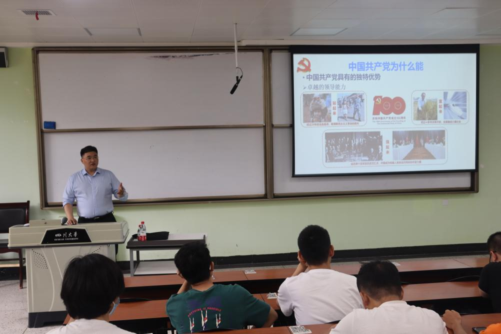 为深入推进党史学习教育走深走实,以更加高昂的状态迎接中国共产党建党100周年,2021年6月11日下午,学院党委刘晓虎书记在四川大学江安校区第一教学楼B103教室为2020级本科生作党史学习教育专题辅导报告。本次辅导报告由2020级辅导员余昕玲老师主持。刘晓虎书记以“学习党史增力量,勇挑重担创一流”为主题,从“中国共产党为什么能”、“马克思主义为什么行”、“中国特色社会主义为什么好”、“学习党史应该获得的力量”四个部分进行重点讲授。