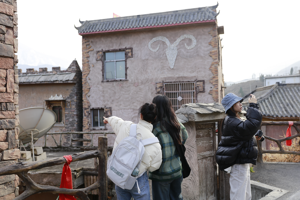 采风团的第一站是到坪头羌寨进行沉浸式体验。坪头羌寨位于岷江上游、茂县县城西南岸的台地上,海拔1688米。村容村貌和村民习俗透出古朴而浓郁的羌风。其建筑充分体现了羌族“依山居止”的传统,灰墙白顶、黄泥片石、房顶的羊角和白石头、窗户的羊头雕花等鲜明的文化特征。村庄内,流水潺潺、小巷通幽,栈道连接着房前屋后。初春之际,房前屋后的田野上,樱桃树、李树、苹果树、梨树等孕育着嫩芽,可以想象坪头羌寨花开时节“房子建在花中,花丛裹着房子,风儿吹来凉爽,溪水流躺柔情”宛若桃源的美景。