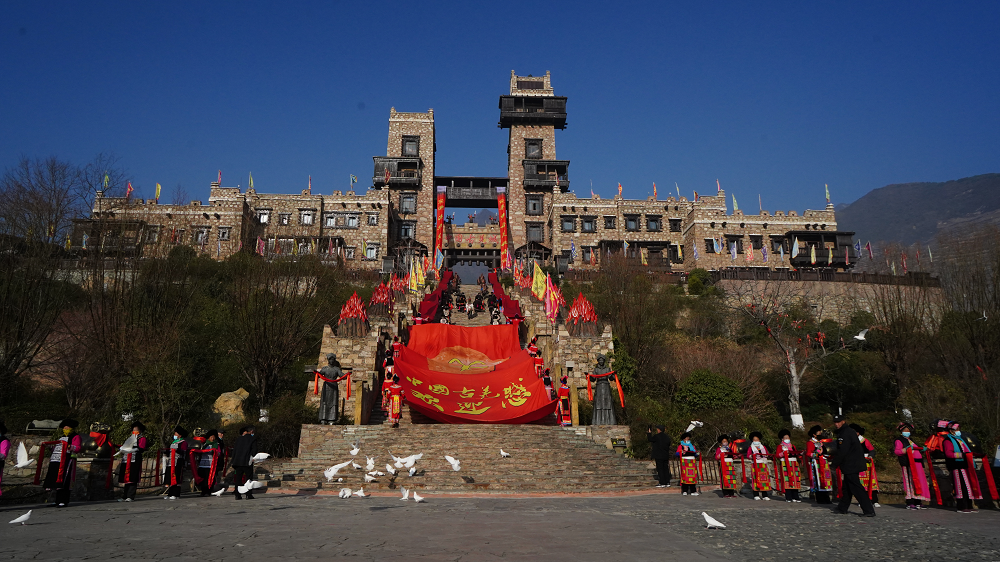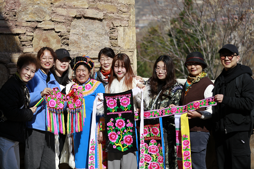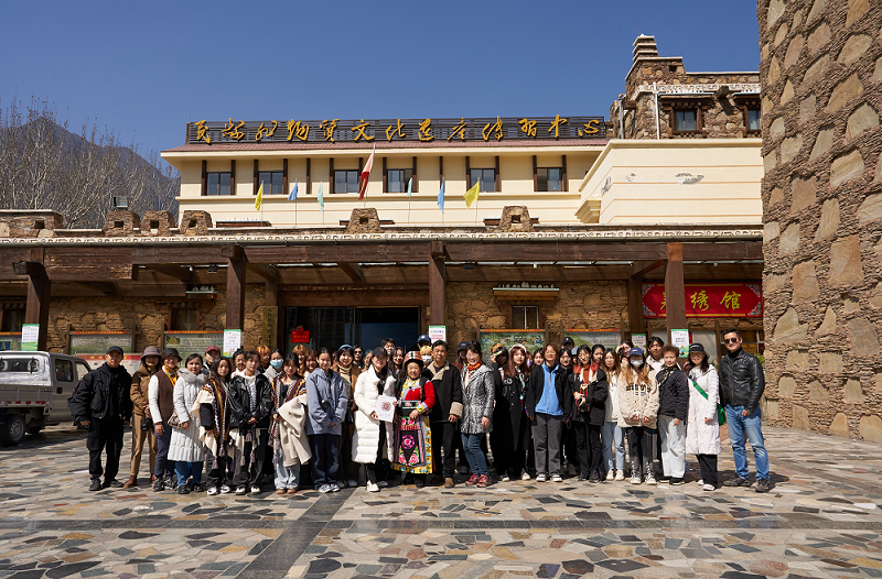 翌日清晨,采风团一行来到了规模宏大、气势雄伟的中国古羌城。中国古羌城延续着羌族传统碉楼建筑风格,是全国规模最大、功能齐全、设施完善的羌文化核心展示地。每天早晨9时许,中国古羌城都会举行开城仪式,身着民族盛装的羌族群众跳起欢快的沙朗,“释比”引领队伍拾阶而上,随着二十米高的巨型古羌城门徐徐打开,羌王羌后率领护卫、羌族姑娘出城,身着盛装的羌族姑娘双手托举着羌红走下台阶,迎接远道而来的客人,让观众感受古代羌王迎接贵客的仪式感。羌族被称为“云朵上的民族”,羌绣、羌笛、羊皮鼓舞、多声部民歌、瓦尔俄足节等非遗文化,蕴含着浓郁的生活气息和民族记忆,令师生们不禁称赞。