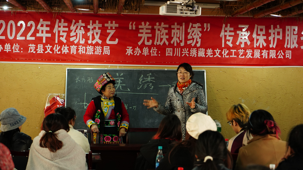 在古羌城内,还坐落着茂县非物质文化遗产传习中心,这里聚集了传统技艺、传统音乐、传统体育竞技游艺、传统医药、民间文学、民间美术等多种门类的非遗项目。通过邀请相关非遗项目传承人进驻传习中心,形成了一个集非遗展示、传习、体验、销售于一体的文化景点,让观众近距离感受羌族非遗的魅力。赵敏副教授邀请了国家级非物质文化遗产项目羌绣传承人李兴秀女士进行对话交流,帮助师生进一步了解羌绣文化。据介绍,羌绣色彩突出、图案多样、做工精巧,技艺上吸收了多种刺绣工艺,风格方面充满了民族审美品味。如今的羌绣,不但实现了非遗技艺的活态传承,还形成了产业,成为羌族女性创业增收的一个风口。对话过后,与会师生针对羌族元素配色、风俗禁忌等话题进行了进一步探讨。面对活态传承与设计转化难题,李兴秀大师既有基于自身经验的周到讲解,也用实物作品向师生们进行了针对性答疑。